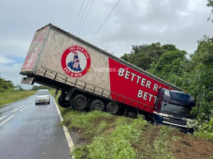 Een vrachtwagen die wordt ingezet om rijst te transporteren, is vandaag langs de Oost-Westverbinding in Suriname van de rijbaan geraakt en deels in de berm terechtgekomen.